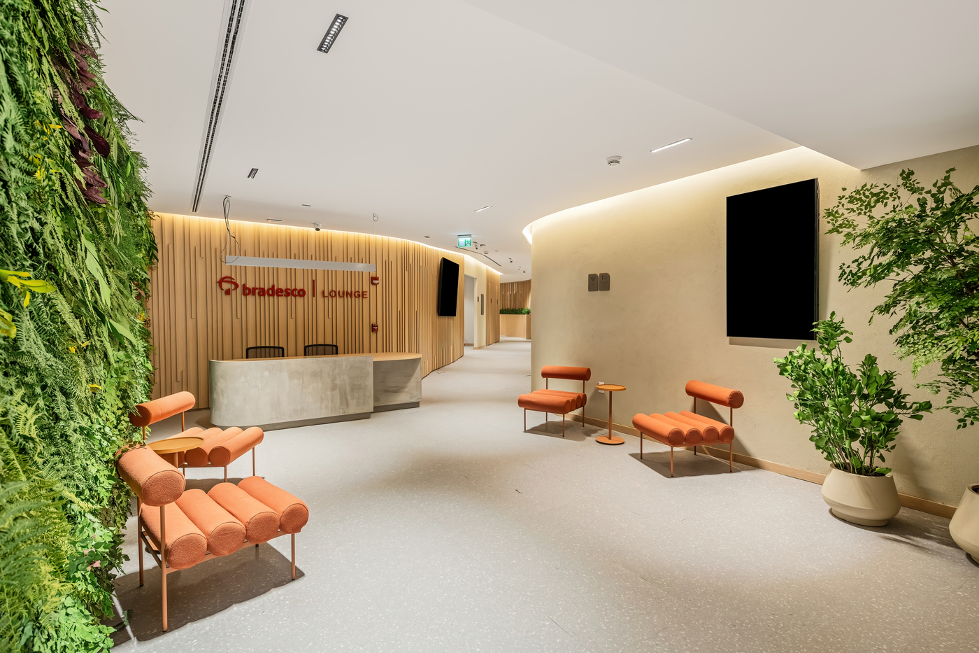 Cada detalhe foi projetado para traduzir o padrão de excelência da marca Bradesco, criando uma experiência de alto padrão para os clientes. Assentos ergonômicos, áreas de descanso privativas e integração entre tecnologia e ambientação garantem uma jornada tranquila e premium.