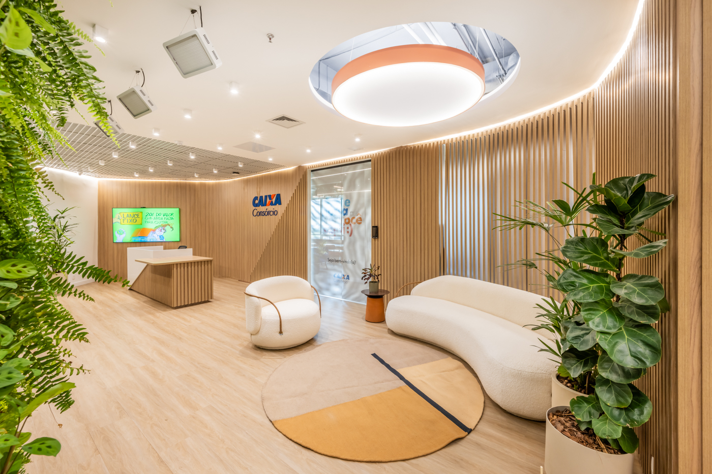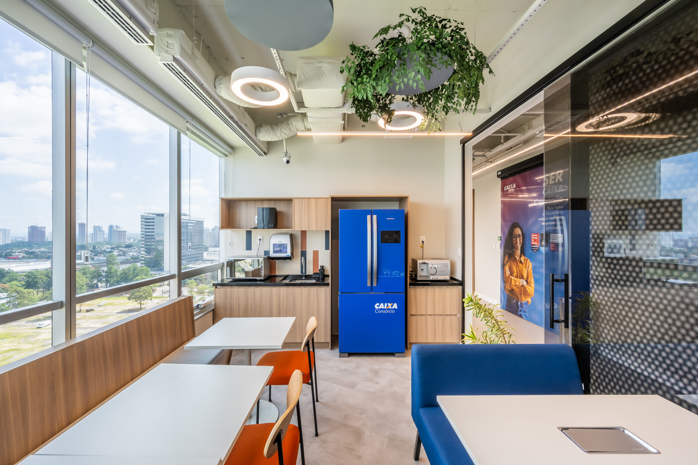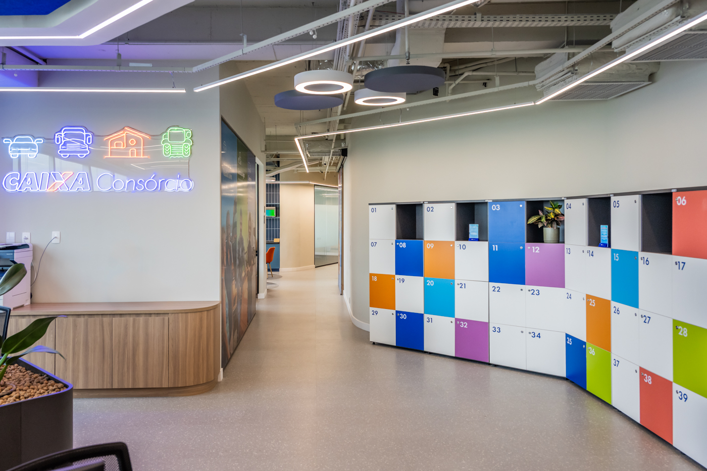 Para a nova sede da Caixa Consórcio, a StudioBR desenvolveu um projeto que traduz os valores da marca em um ambiente contemporâneo, funcional e acolhedor. A proposta equilibra a solidez institucional da Caixa com uma linguagem leve e atual, que favorece a integração entre equipes e a fluidez nos fluxos de trabalho.