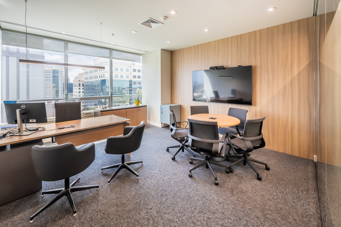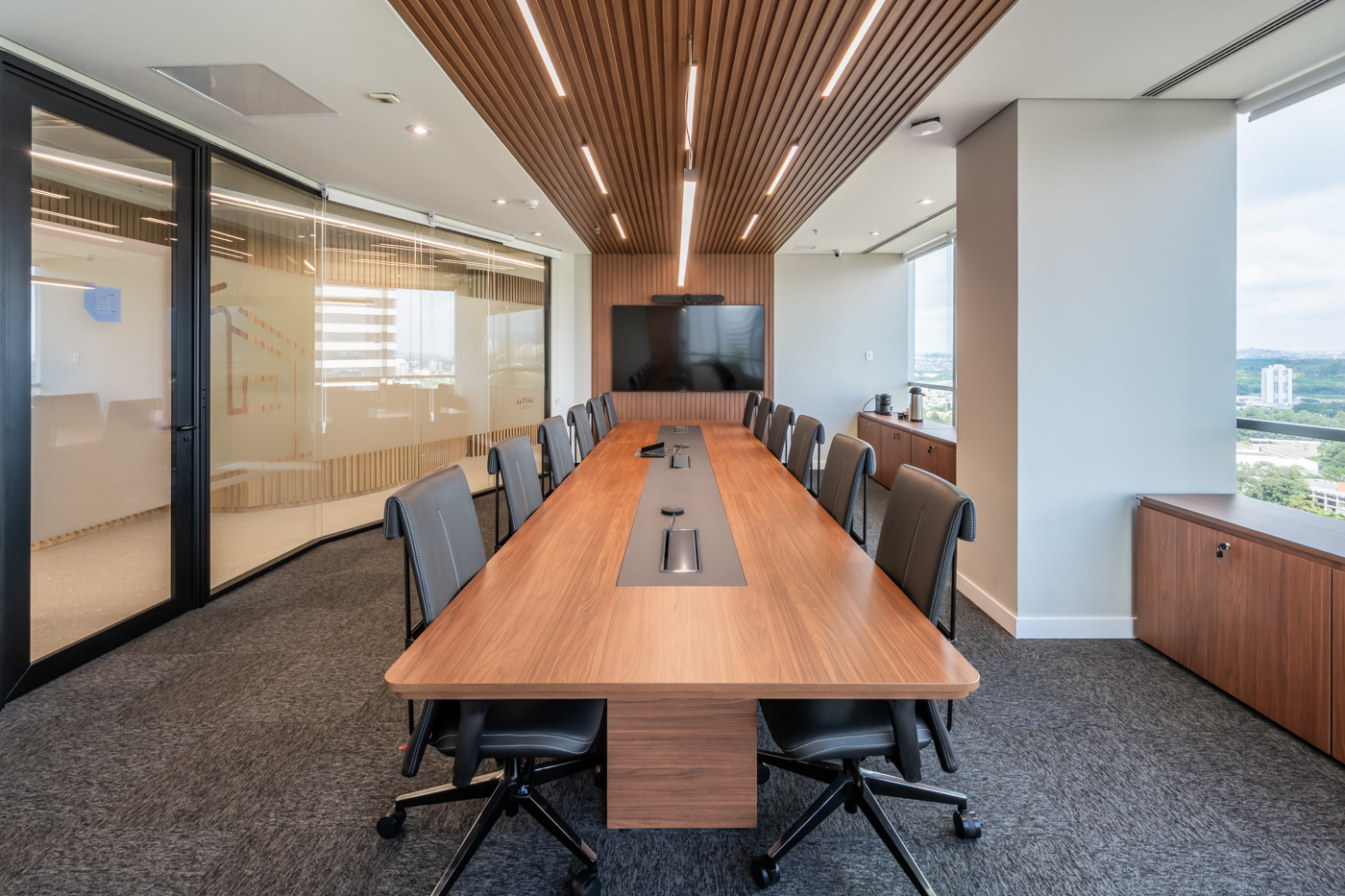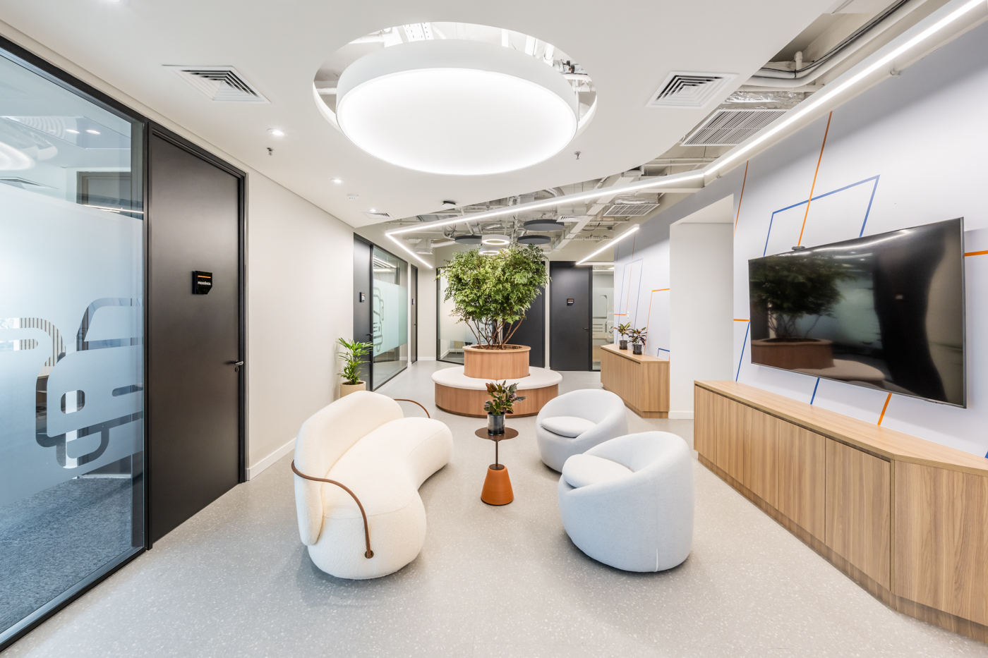 A paleta de materiais reflete confiança e transparência, enquanto as soluções de layout valorizam a experiência dos colaboradores e visitantes. O resultado é um espaço corporativo que reforça a identidade da empresa e promove bem-estar, produtividade e conexão — onde a vida acontece.